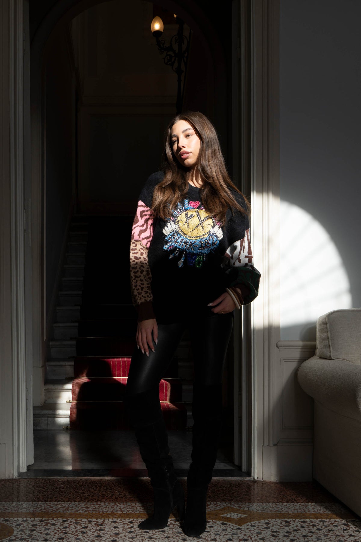 Designed to stand out while remaining refined, this knit sweater features a striking central graphic enriched with decorative detailing. The relaxed silhouette and mixed-pattern sleeves create a strong visual balance, making it an effortless statement piece for modern wardrobes. Ideal for pairing with denim or tailored bottoms, it brings personality and polish to everyday styling.