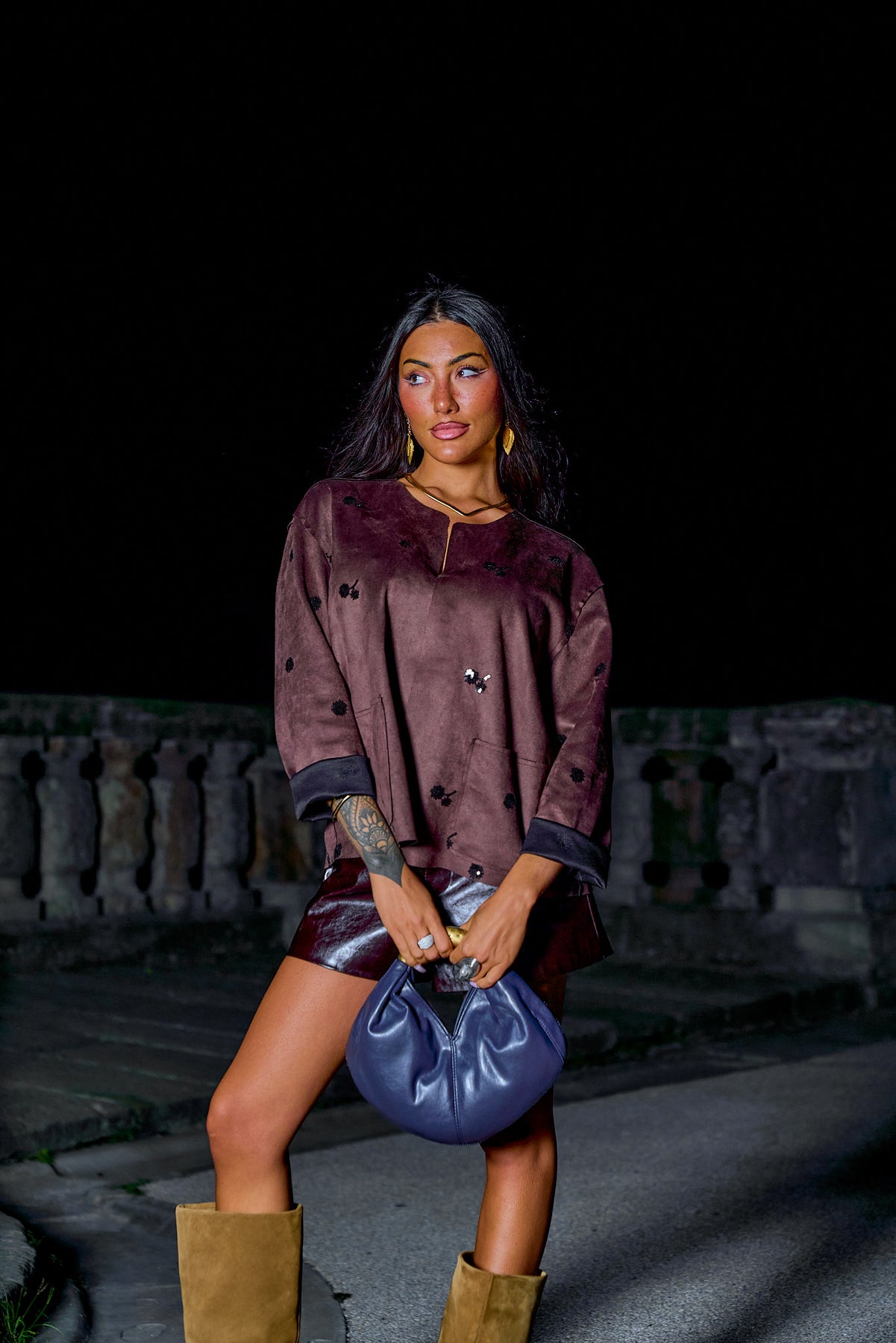 A soft structured piece with delicate charm. The suede fabric is adorned with subtle floral embroidery, blending sophistication with ease. Its relaxed silhouette and front pockets make it a refined option for both daytime wear and evening layering.
