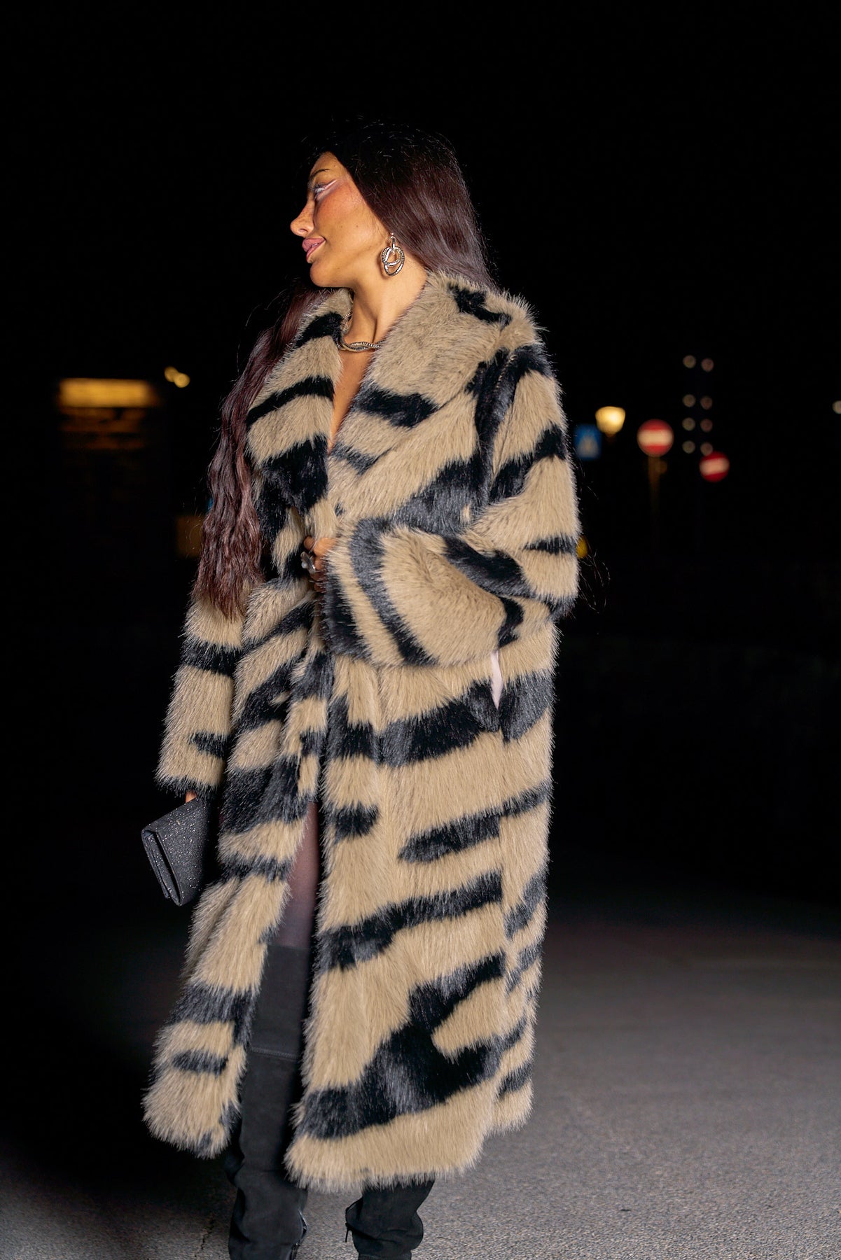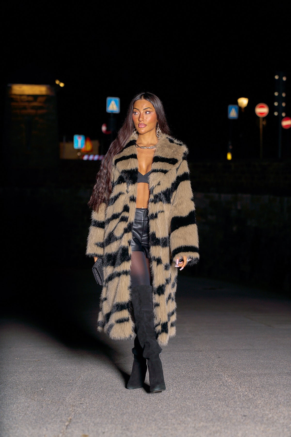 An expression of timeless allure and modern refinement, this long striped faux fur coat exudes sophistication with every movement. The elongated silhouette enhances its dramatic elegance, while the soft, dense texture wraps you in warmth and comfort. A true statement piece for elevated winter dressing.