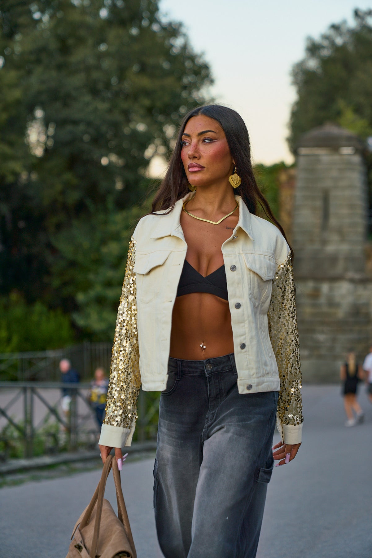 An iconic blend of casual charm and refined sparkle. This cream-toned denim jacket features statement gold sequin sleeves that catch the light beautifully, offering a perfect balance between structure and glamour. Ideal for dressing up everyday looks or adding a touch of shine to evening wear.
