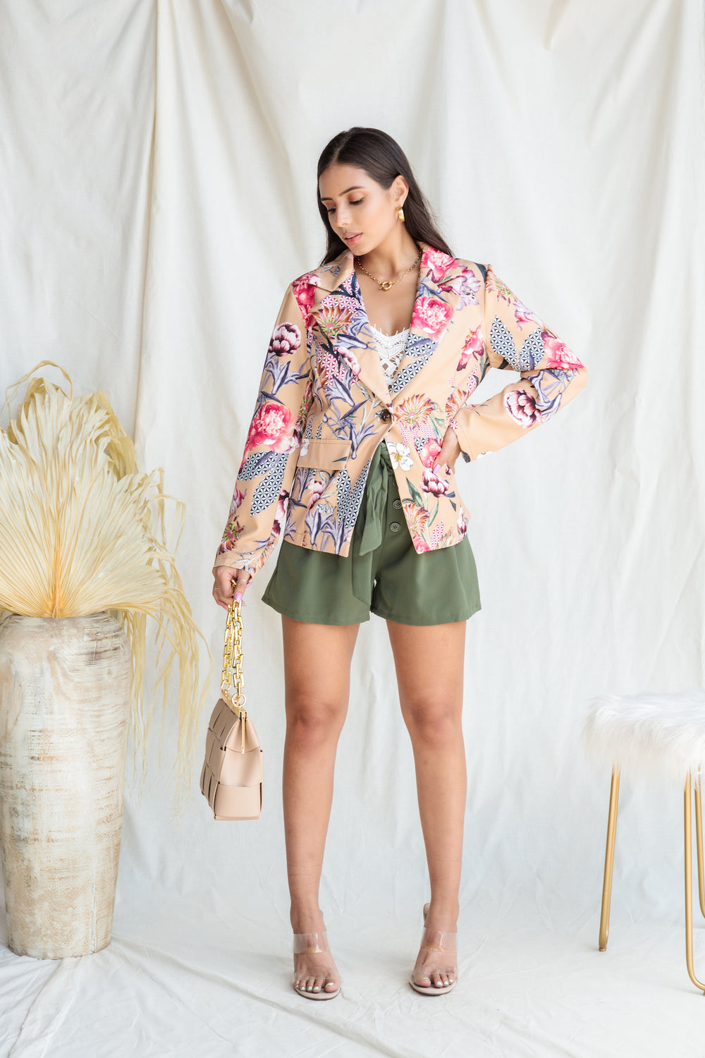Pantalón Corto de Lino con Cinturón Estampado Abstracto
